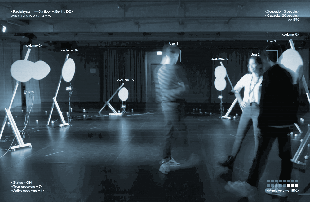 The installation consists of a system of speakers distributed throughout a room. Each speaker is computationally enhanced with an ultrasonic sensor programmed to adjust the volume of the music based on its distance from the listener. The installation's functioning does not depend on each user but rather on the collectivity. Therefore each visit is unique, depending on the number of people present, their proximity to the speakers, and their behaviors. All in all, you need people to throw a real party.